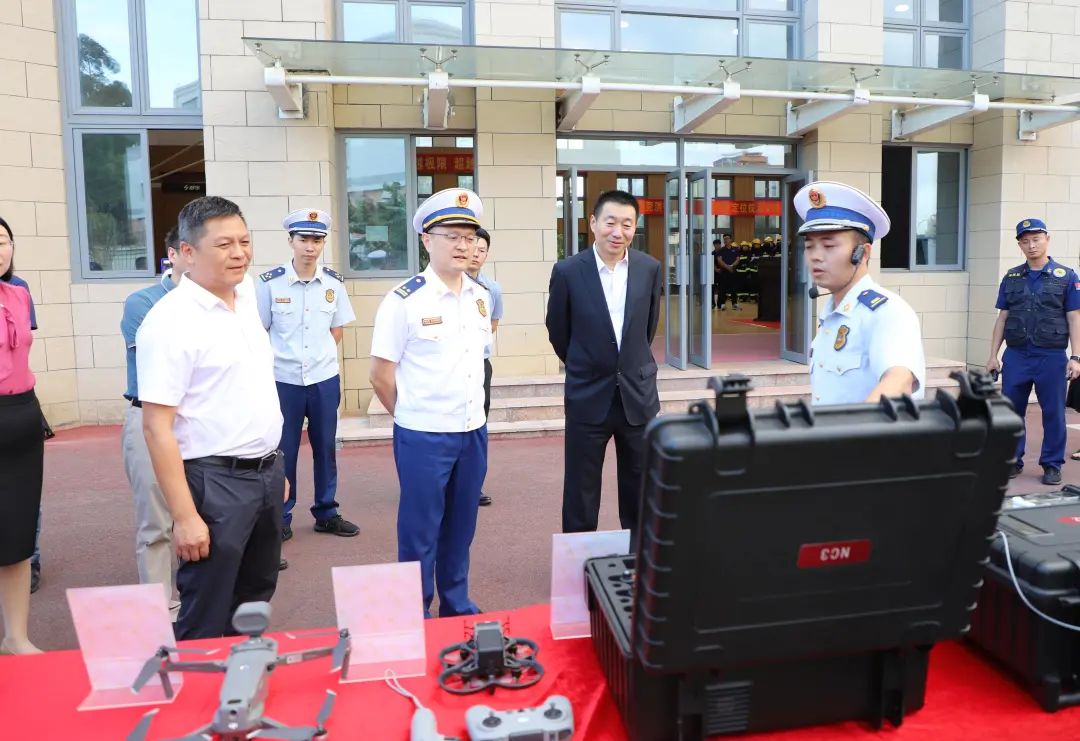 仪式前,市消防救援支队领导与园区主要领导参观了水域教研室、真烟真火实训基地等消防专业力量建设。随后参观了无人机专业队相关车辆器材、无人机操法展示,真切感受到了“低空经济”在消防领域的实战应用。包括配备的专为高层火灾设计的大型灭火无人机,可实现40公斤物资吊运的中型载重无人机,装有喷火、抛投、喊话、照明等挂载的多功能无人机、可在狭小空间侦察穿越的穿越机;以及轻型卫星便携站、应急指挥系统等卫星通信装备。充分展示了无人机专业队“察打保”一体,“空天地”融合的新质战斗力。